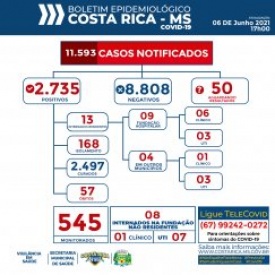 Seis pessoas de Costa Rica estão internadas em leito de UTI – Unidade de Terapia Intensiva em Costa Rica - sendo 03 residentes e 03 residentes internado na UTI em Campo Grande – MS. Há ainda oito pessoas internadas em UTI na fundação hospitalar moradoras de outros municípios.