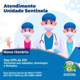 Para melhor atender a população costarriquense a Secretaria Municipal de Saúde, informa que a Unidade Sentinela atenderá todos os dias, incluindo finais de semana e feriados, das 7 às 21 horas.