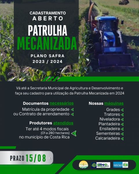 SEMAD abre cadastramento da patrulha mecanizada para a safra 2023-2024