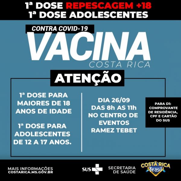 Pessoas de 12 anos acima tomam 1ª dose contra Covid-19 no próximo domingo em Costa Rica