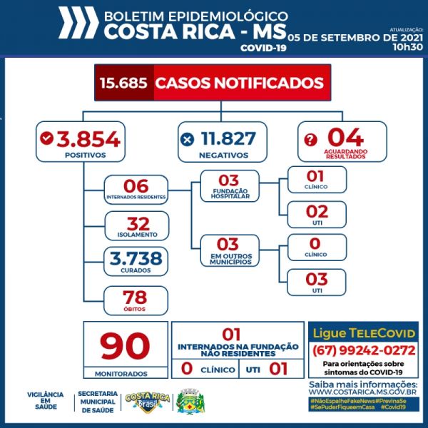 Boletim Epidemiológico: Costa Rica chega aos 3.854 casos confirmados do novo Coronavírus neste domingo (05)
