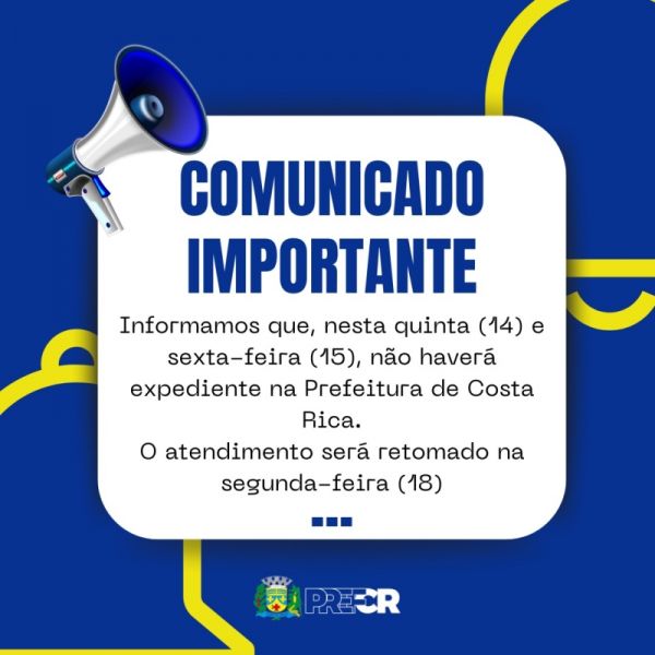 Prefeitura de Costa Rica não abre nesta quinta e sexta-feira por ponto facultativo e feriado