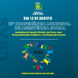 O Município de Costa Rica, através do Conselho Municipal de Assistência Social, realizará no dia 13 de agosto a 12ª Conferência Municipal de Assistência Social. O evento acontecerá das 7h às 11h da manhã, no auditório Professora Edna Maria Jacinto da Silva, na SEMED (Secretaria Municipal de Educação).