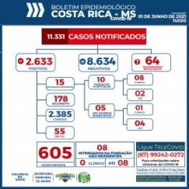 Seis pessoas de Costa Rica estão internadas em leito de UTI – Unidade de Terapia Intensiva em Costa Rica - sendo 02 residentes, 03 residentes internado na UTI em Campo Grande – MS e 01 em Várzea Grande – MT. Há ainda oito pessoas internadas em UTI na fundação hospitalar, moradoras de outros municípios.