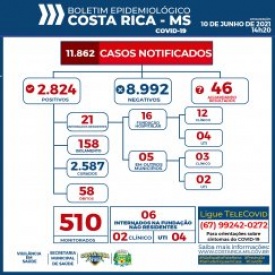Seis pessoas de Costa Rica estão internadas em leito de UTI – Unidade de Terapia Intensiva em Costa Rica - sendo 04 residentes e 02 residente internados na UTI em Goiânia – GO. Há ainda quatro pessoas internadas em UTI na fundação hospitalar, moradoras de outros municípios.