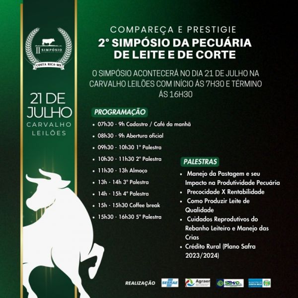 Costa Rica realiza 2º Simpósio da Pecuária de Leite e de Corte dia 21 de julho
