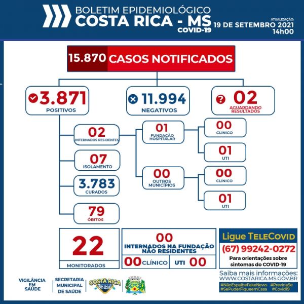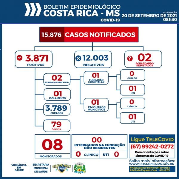 Boletim Epidemiológico: Costa Rica mantém 3.871 casos confirmados do novo Coronavírus neste domingo(19/09)