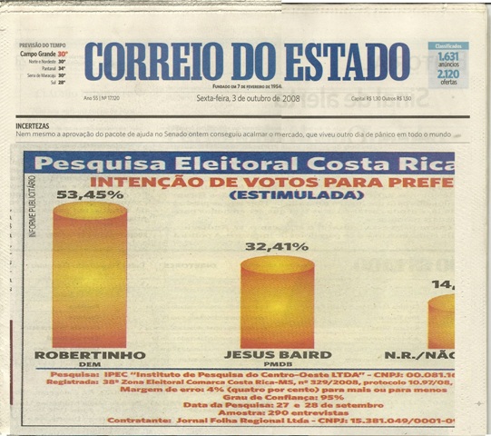 Em 2008 a pesquisa publicada por Robertinho no Correio do Estado garantia a vitória, ele perdeu a eleição